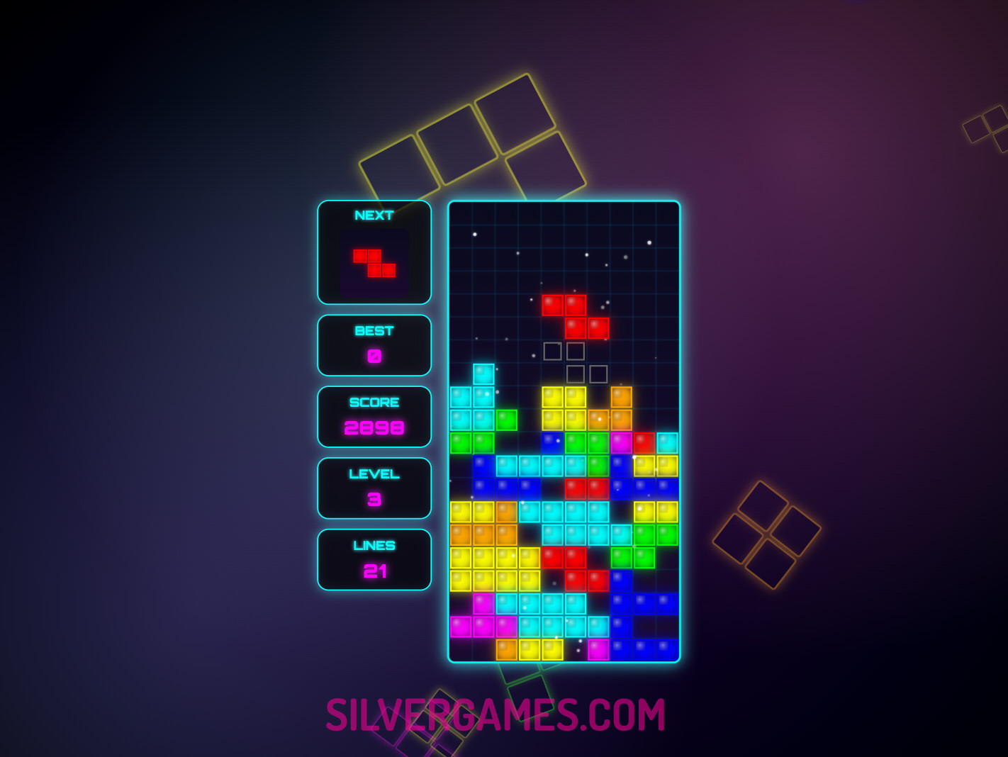 As you progress, the shapes become trickier, and the pace intensifies. Each cleared line glows with satisfying effects, making every move rewarding. The game continues until no more pieces can fit, so the challenge is to last as long as possible while aiming for a high score. How long can you keep the board clear and build the ultimate glowing score in this tetris-like game? Find out now and have fun playing Glow Blocks, online and free on Silvergames.com!