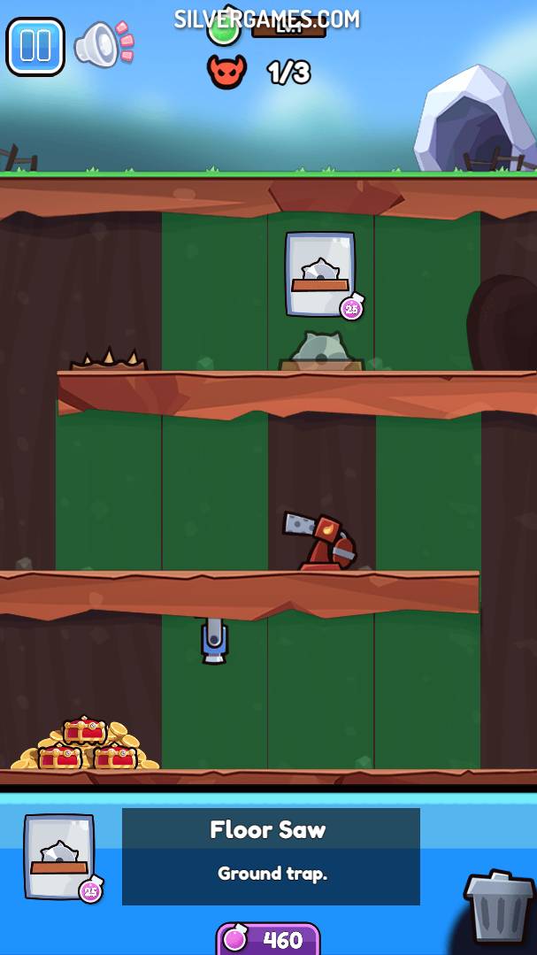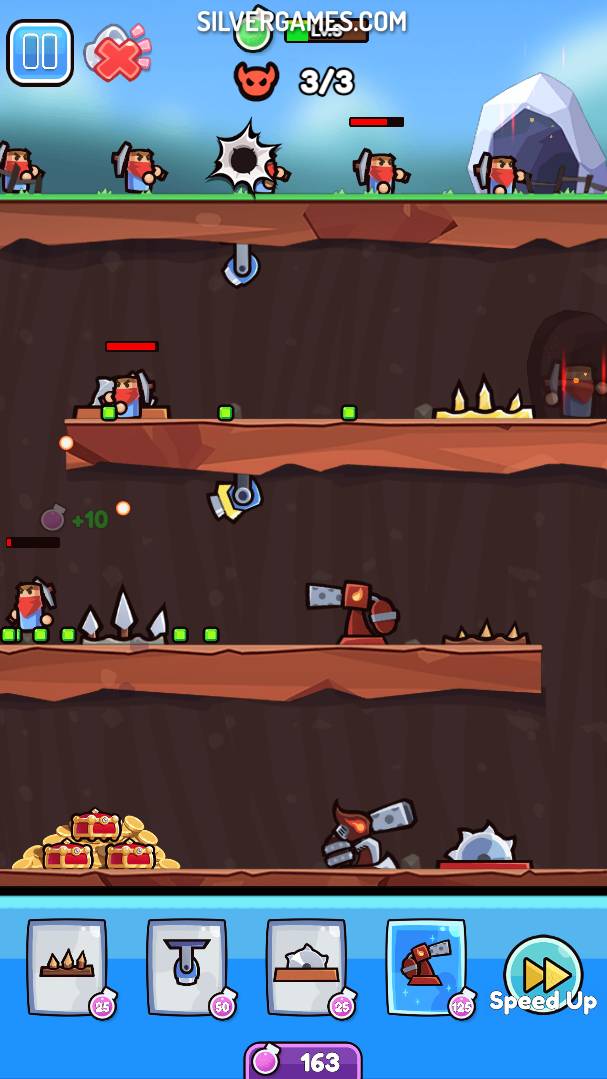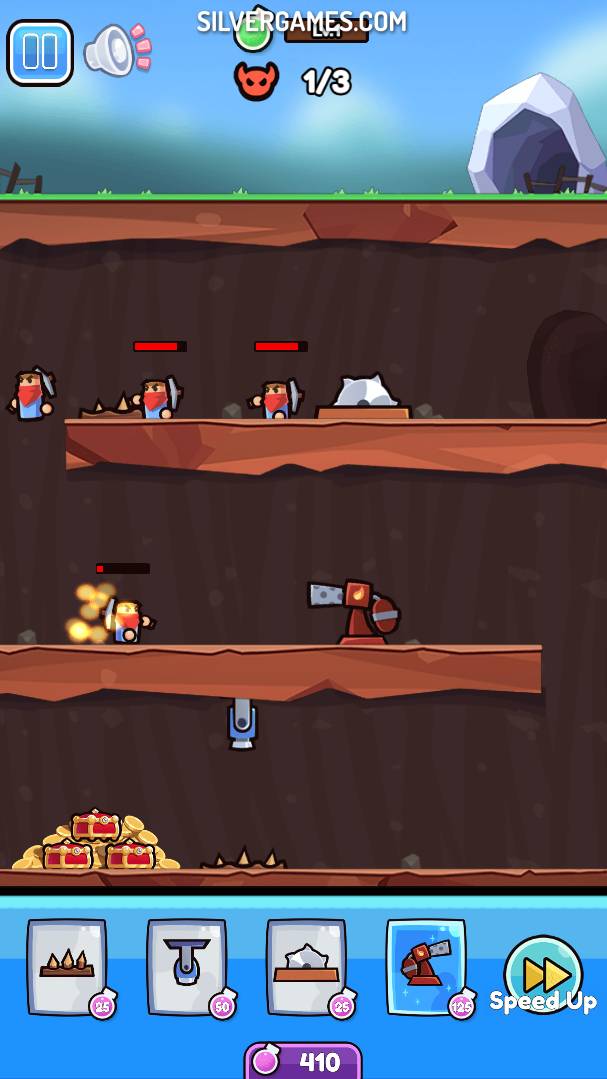 Each trap will cost you some mana, so you will have to be a real strategist to determine which traps to place at each part of the path. You have a wide variety of resources, such as spikes that come out of the ground, spinning saws, motion-sensing guns and more. You can place them along the path and also upgrade them, but the important thing is to manage your mana points well. Have fun playing Gold Miner Tower Defense!