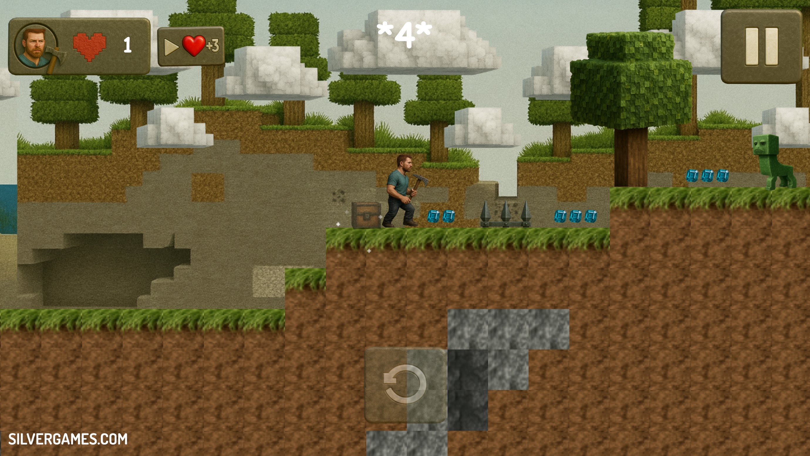 Guide Steve through the ultra-realistic block world and help him reach the portal. The journey won’t be easy. Dangerous monsters are waiting around every corner and the environment is full of challenges. Collect all the diamonds you can, and don’t miss the chests scattered along the way. Opening them will give you rewards and the chance to crush the monsters standing in your path. To complete each stage, you must reach the portal safely. Focus on free building in creative mode or test your endurance in survival mode. Have fun!