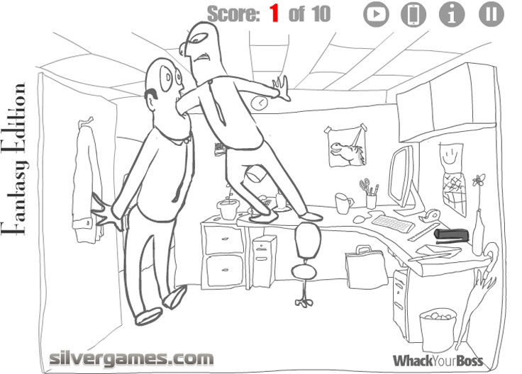 Whack Your Boss 2 is a fantastic new sequel of the funny beat the boss game with the familiar dark sense of humor. Did you have fun with the last boss fight? Then you will love the new Whack Your Boss 2 Fantasy Edition! Your final job is to find all 10 items to whack your boss again and again. This time even magical creatures came to help you destroy your annoying boss.